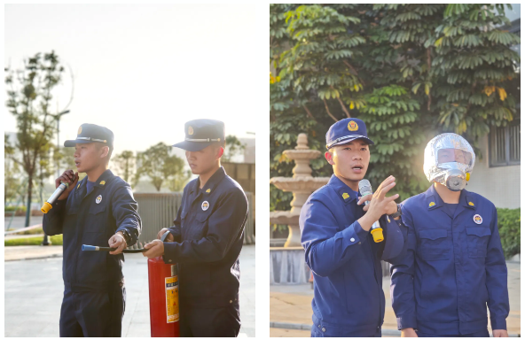 演练期间,现场演示讲解了防烟面罩的正确佩戴技巧,以及灭火器的正确使用方法。依照“提、拔、握、压”四字口诀,园区各部门员工依次进行了灭火器实操,进一步提高了掌握消防器材使用要领的能力。
